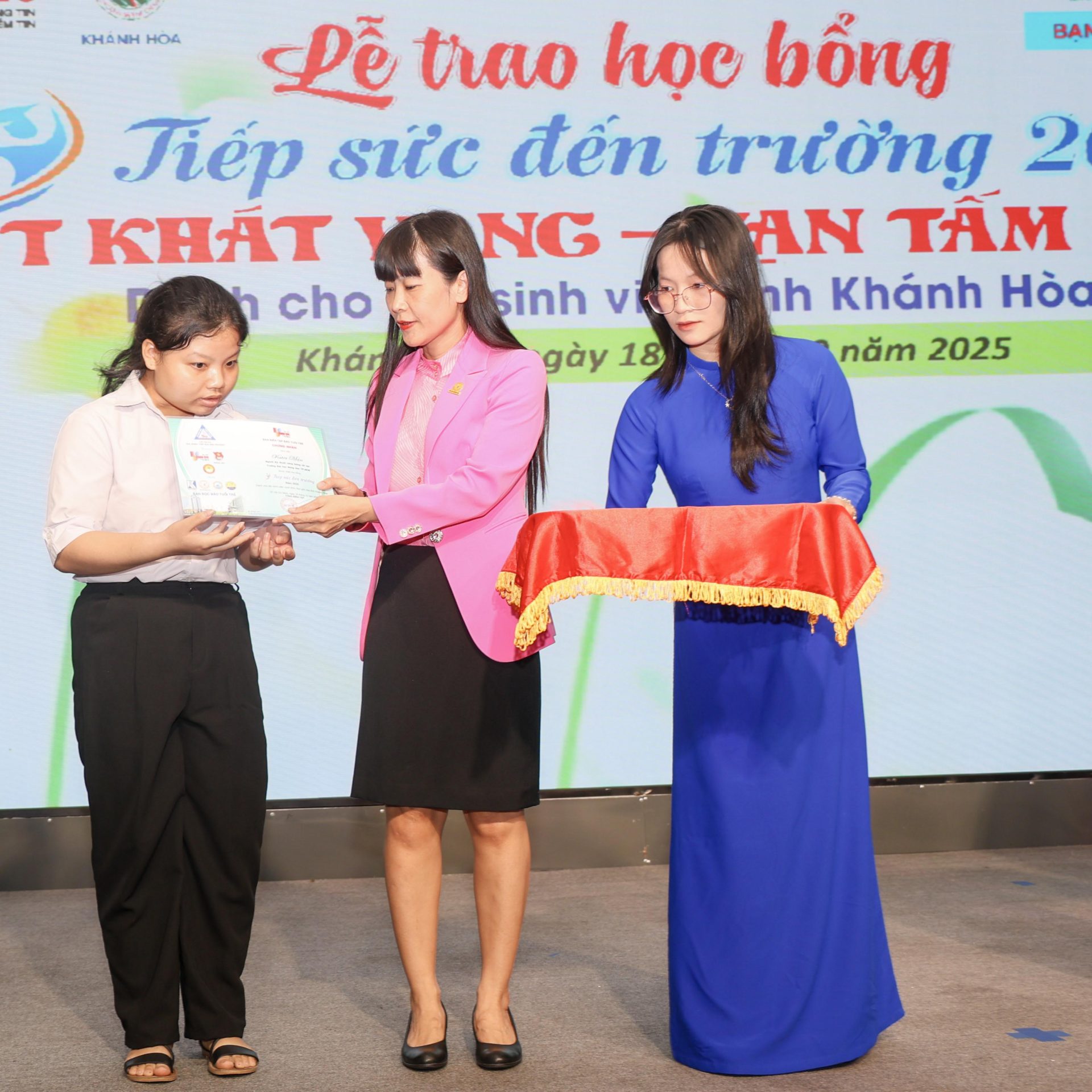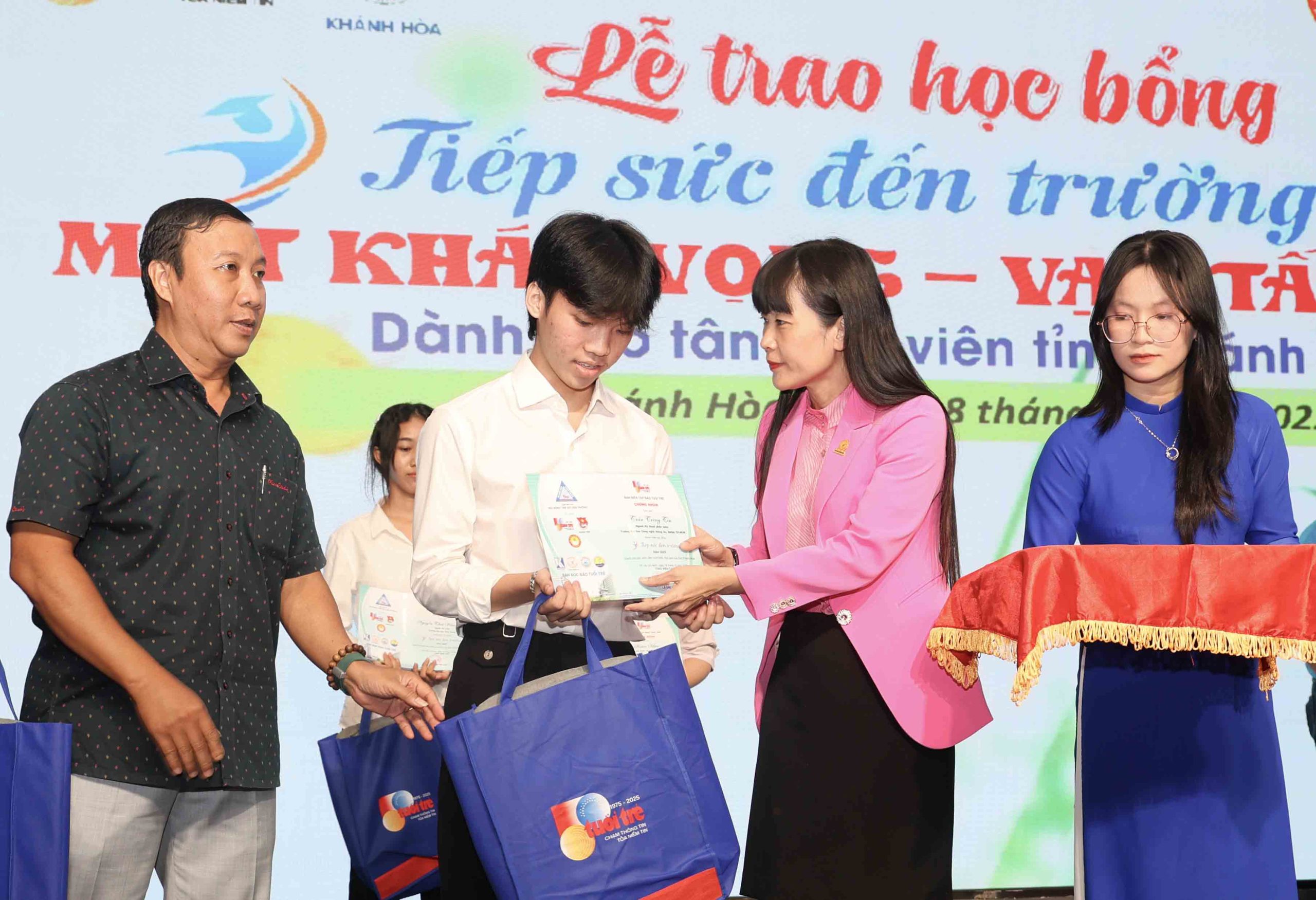📌Tham dự sự kiện, Bà Trịnh Thị Hồng Vân – Chủ tịch HĐTV Công ty Yến sào Khánh Hoà đã trao học bổng tổng giá trị 225 triệu đồng cho quỹ học bổng, góp phần hỗ trợ tân sinh viên có hoàn cảnh khó khăn trên địa bàn tỉnh.