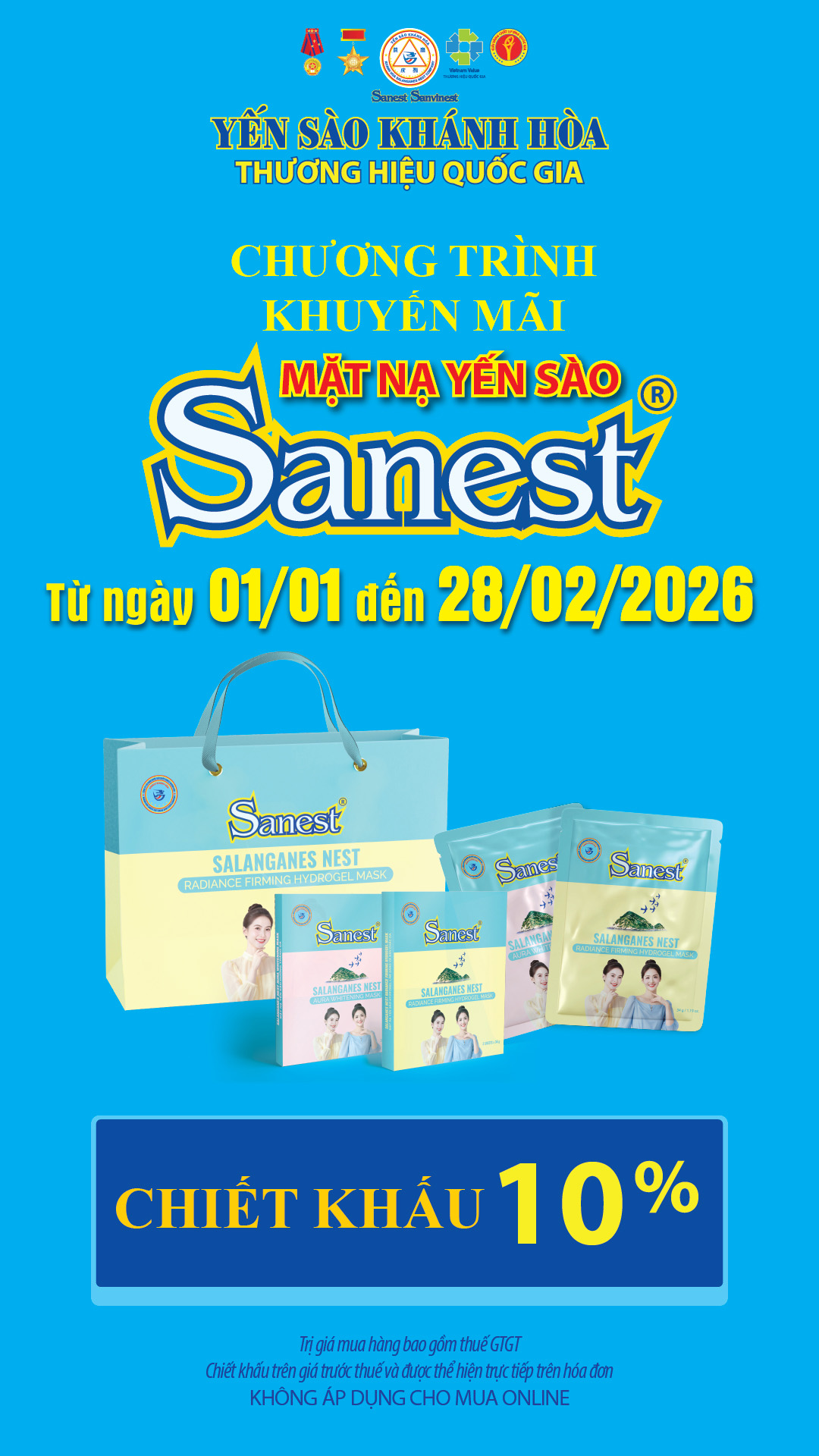 Chương trình khuyến mãi sản phẩm Mặt nạ Yến sào Sanest áp dụng tại hệ thống Cửa hàng GTSP trực thuộc Công ty từ ngày 01/01/2026 đến hết ngày 28/02/2026