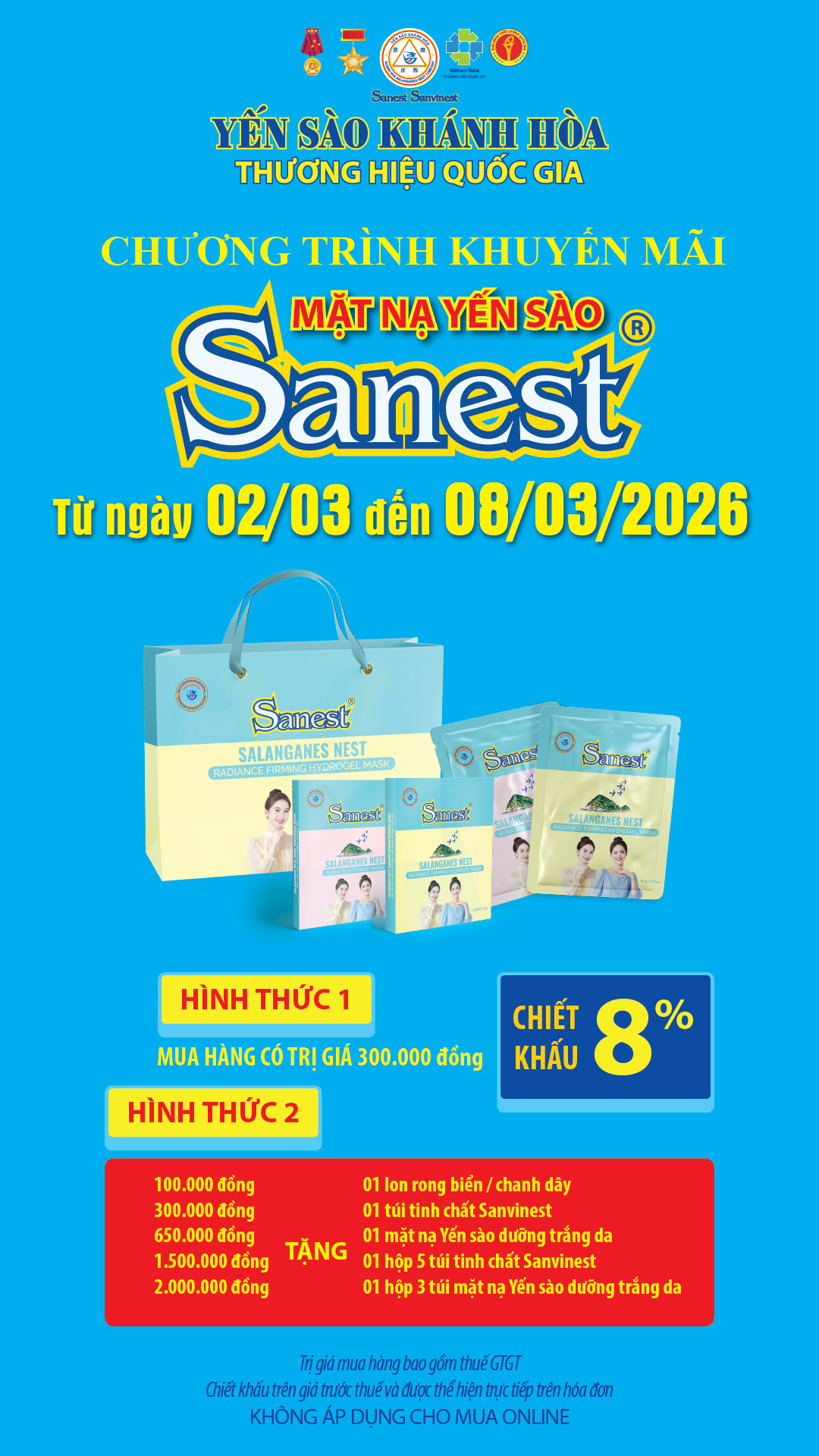 Chương trình khuyến mãi sản phẩm Mặt nạ Yến sào Sanest áp dụng tại hệ thống Cửa hàng GTSP trực thuộc Công ty từ ngày 02/03/2026 đến hết ngày 08/03/2026