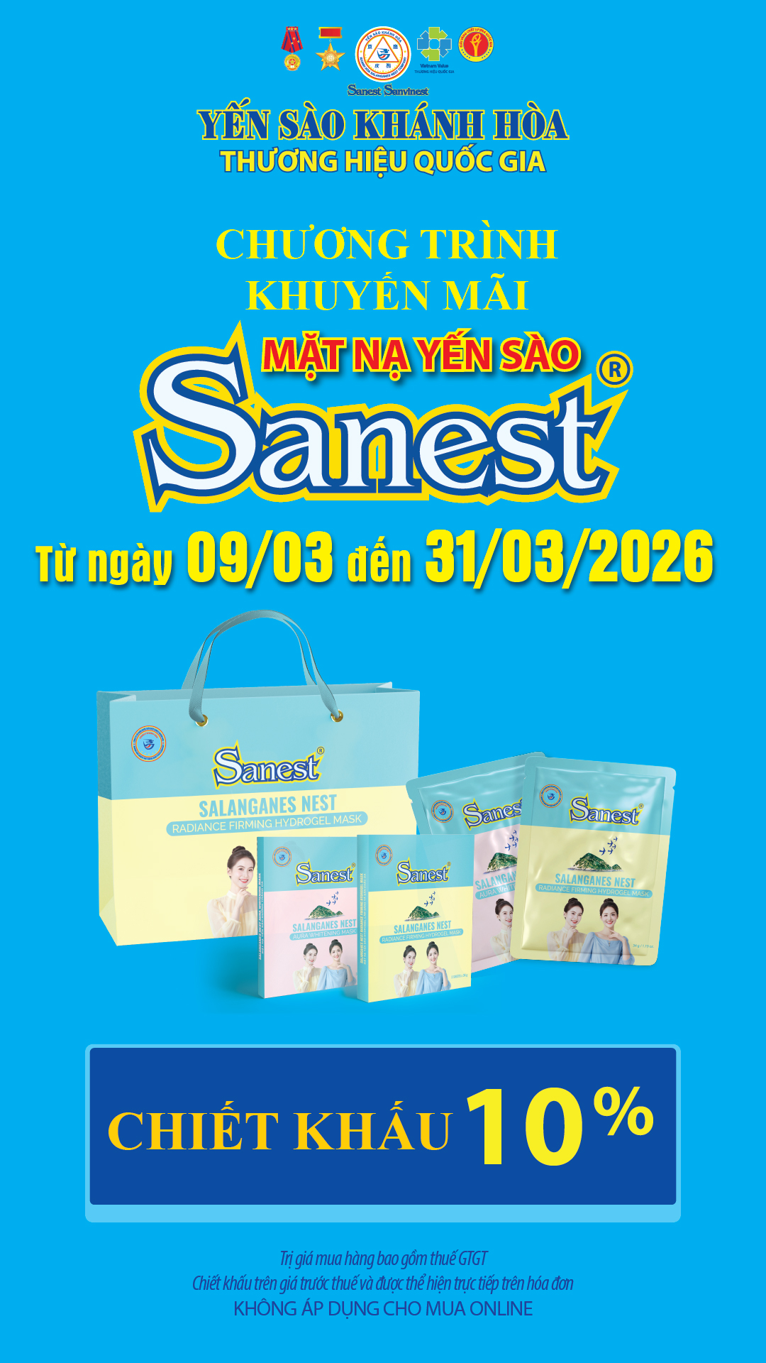 Chương trình khuyến mãi sản phẩm Mặt nạ Yến sào Sanest áp dụng tại hệ thống Cửa hàng GTSP trực thuộc Công ty từ ngày 09/03/2026 đến hết ngày 31/03/2026