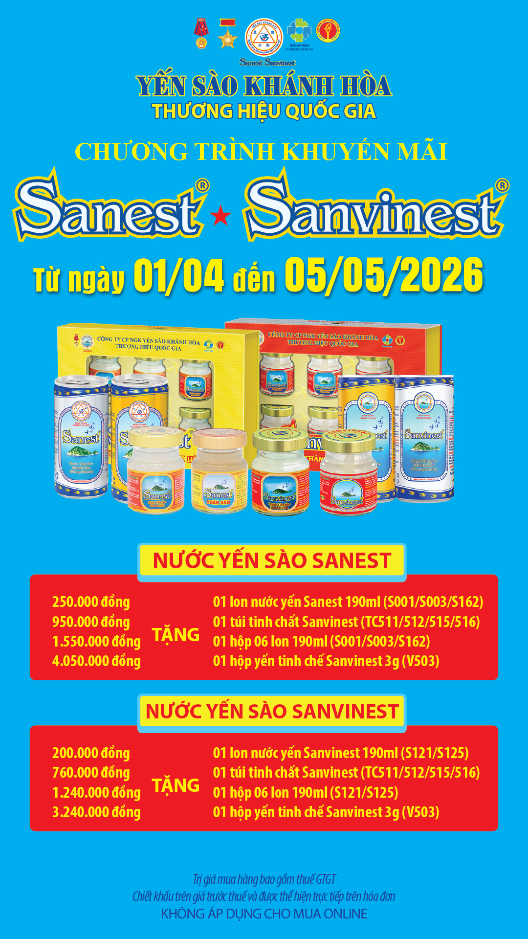 - Chương trình khuyến mãi sản phẩm Nước Yến sào Sanest, Sanvinest áp dụng tại hệ thống Cửa hàng GTSP trực thuộc Công ty từ ngày 01/04/2026 đến hết ngày 05/05/2026