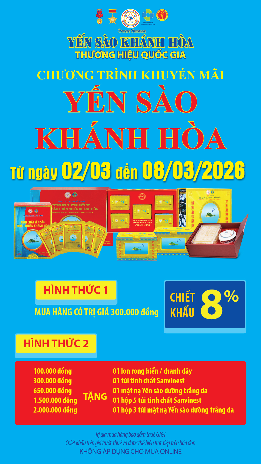 Chương trình khuyến mãi sản phẩm Yến sào đảo thiên nhiên tinh chế và tinh chất yến sào áp dụng tại hệ thống Cửa hàng GTSP trực thuộc Công ty từ ngày 02/03/2026 đến hết ngày 08/03/2026