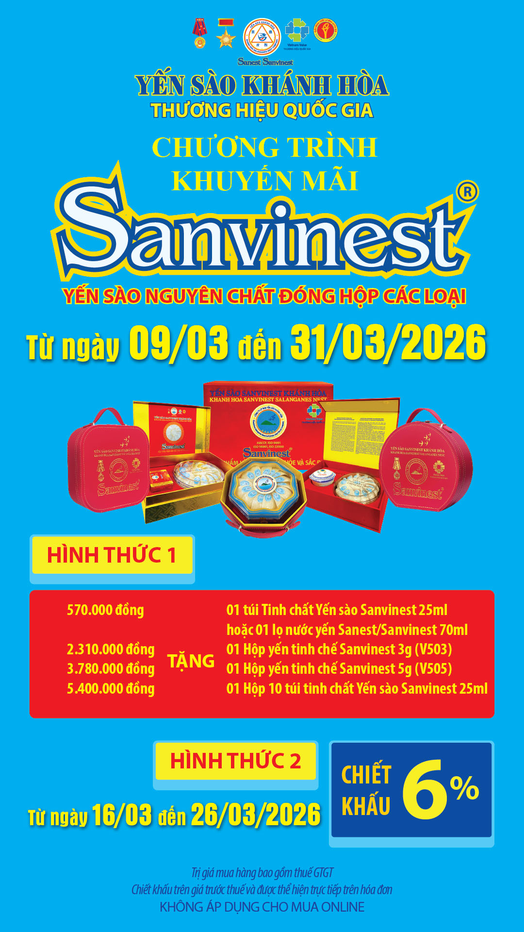 Chương trình khuyến mãi Yến nguyên chất Sanvinest áp dụng tại hệ thống Cửa hàng GTSP trực thuộc Công ty từ ngày 09/03/2026 đến hết ngày 31/03/2026