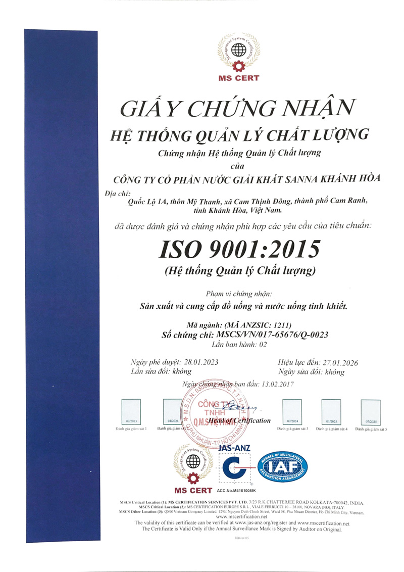 Công ty Cổ phần nước giải khát Sanna Khánh Hòa vinh dự nhận được chứng nhận tiêu chuẩn ISO 9001:2015