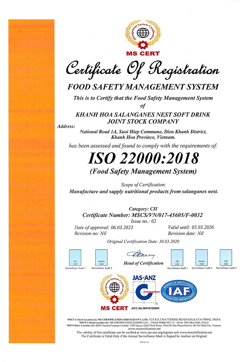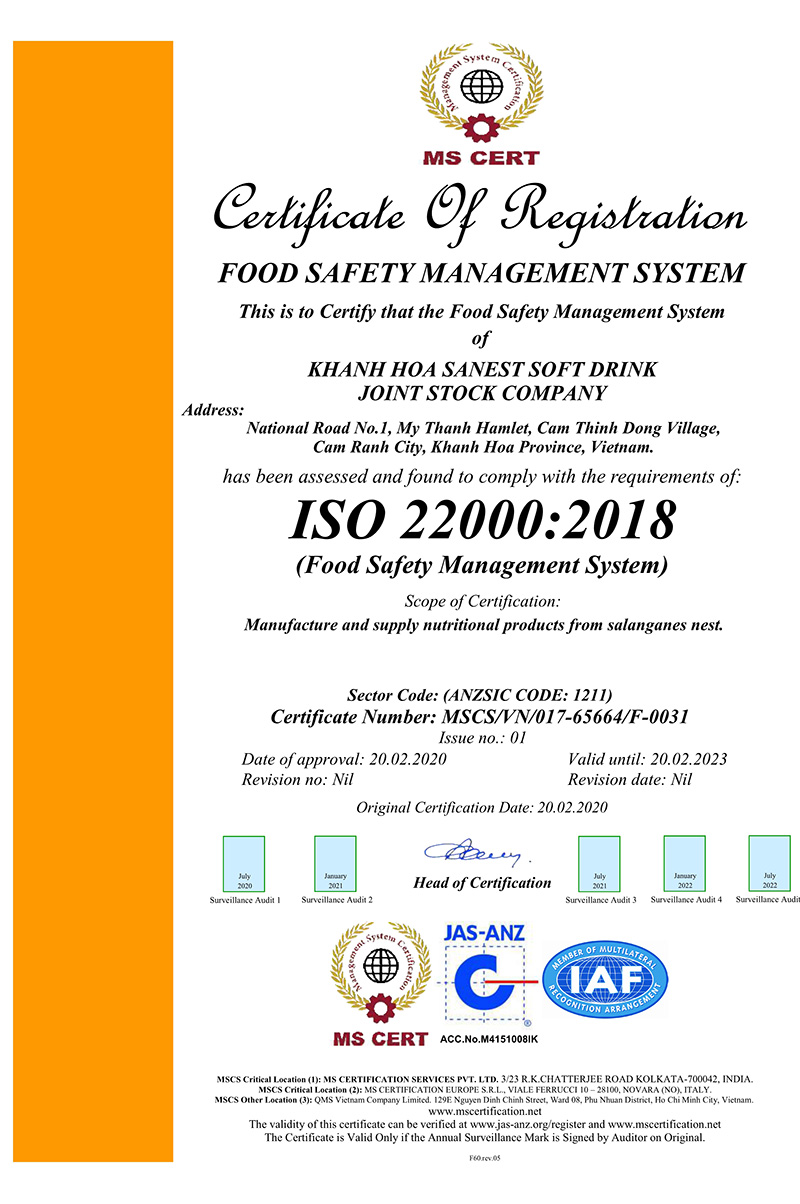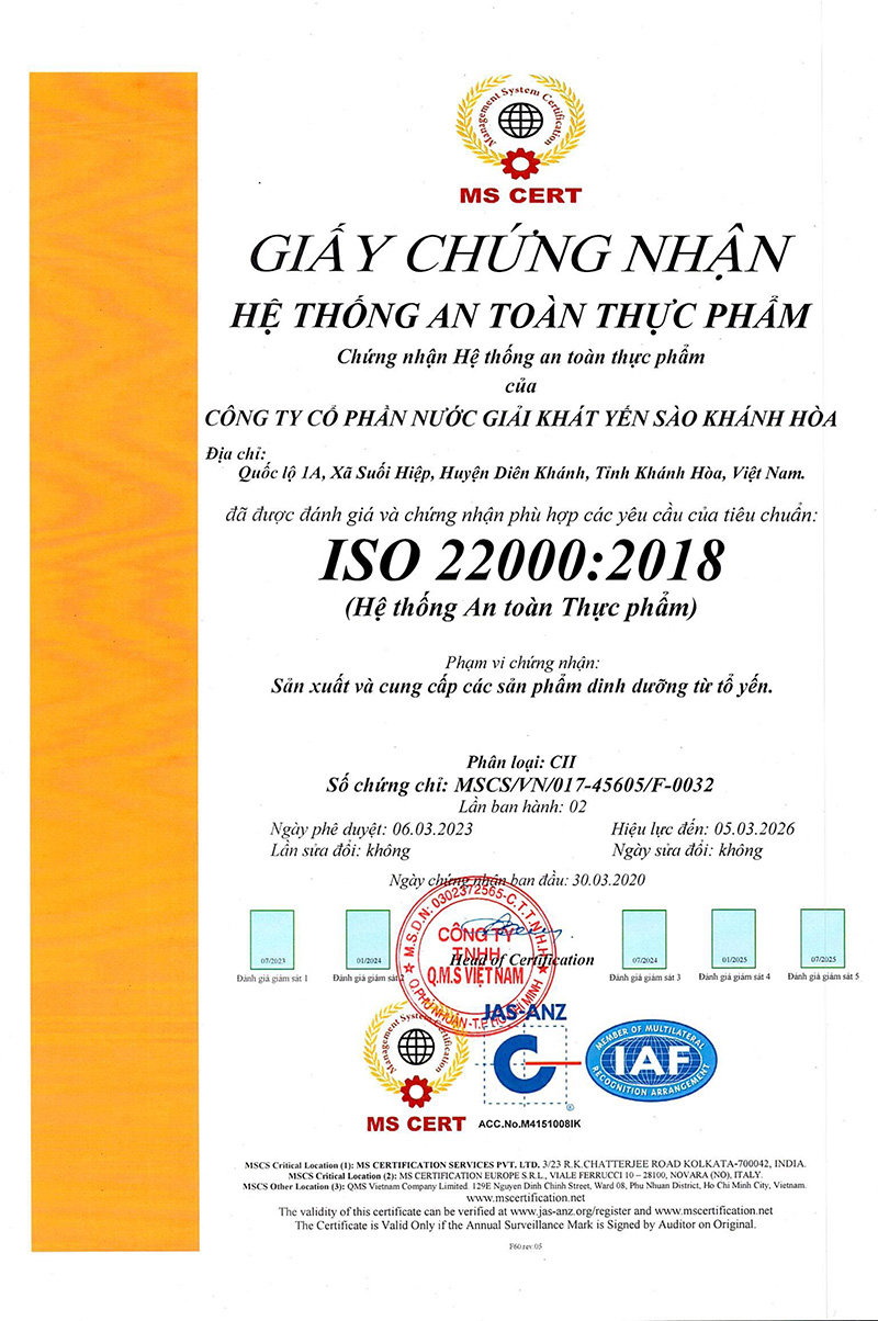 Công ty CP Nước giải khát Sanest Khánh Hòa và Công ty CP Nước giải khát Yến sào Khánh Hòa vinh dự nhận được chứng nhận tiêu chuẩn ISO 22000:2018