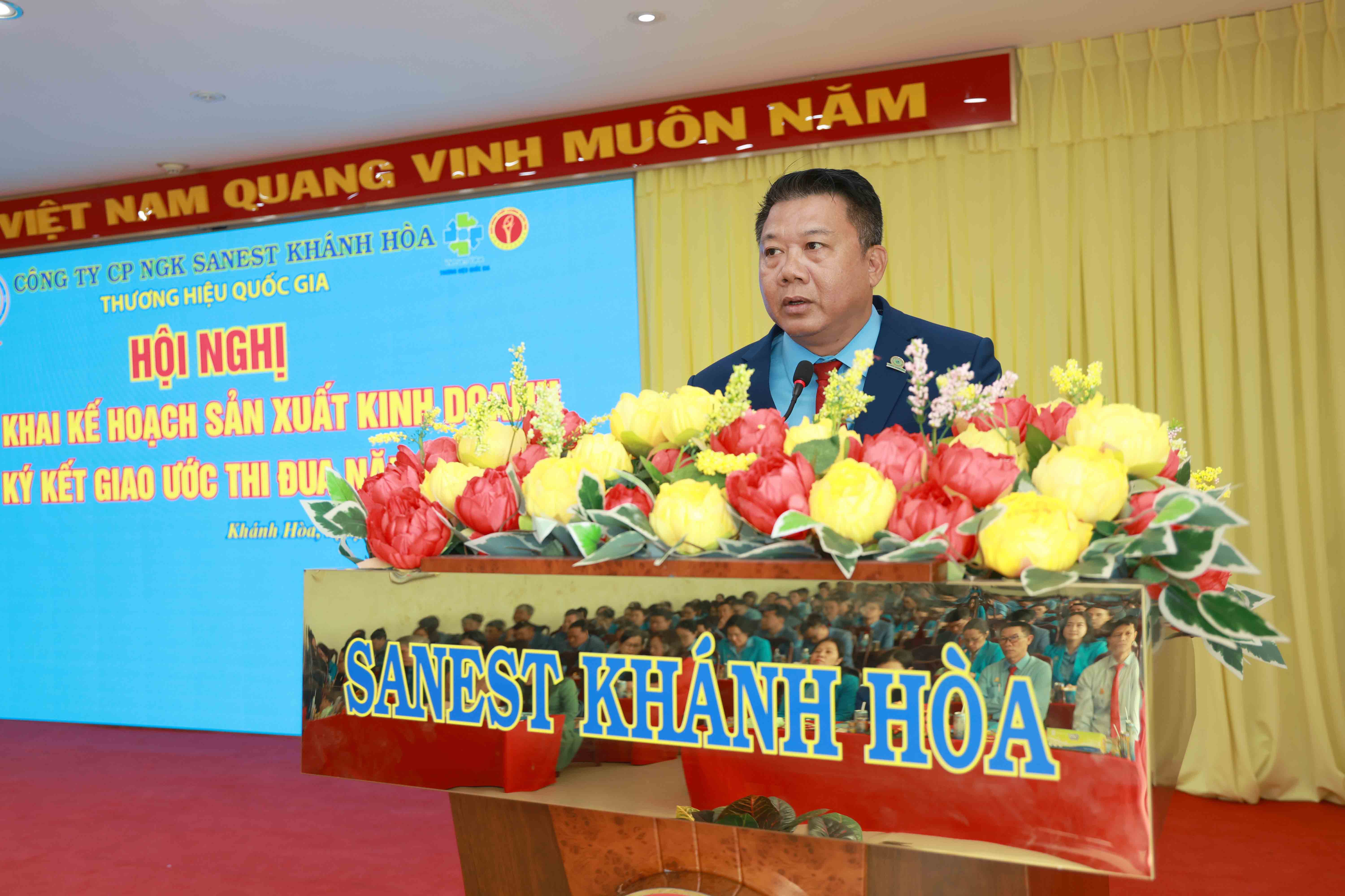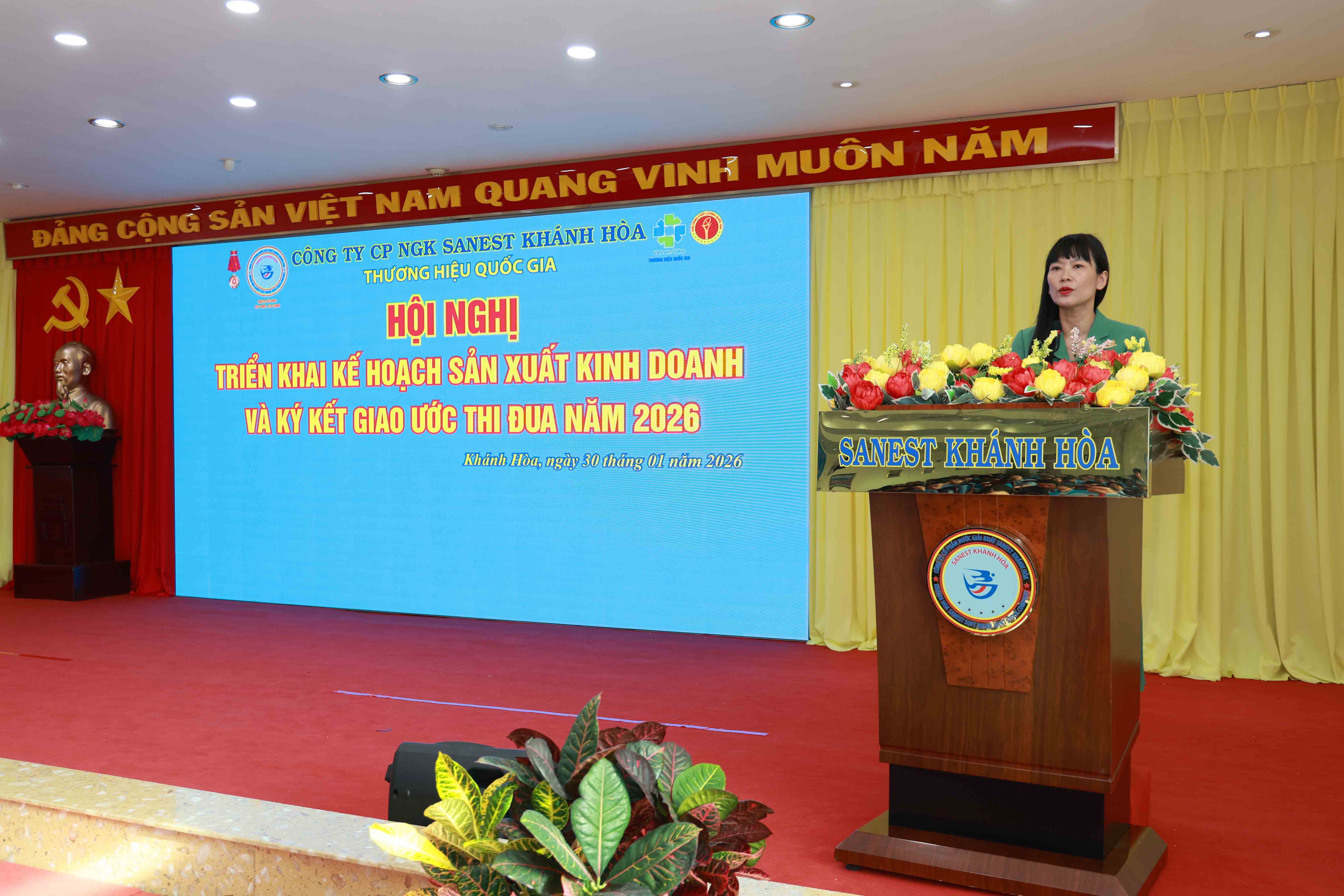 Phát biểu chỉ đạo tại Hội nghị, Đ/c Trịnh Thị Hồng Vân – Chủ tịch HĐTV Công ty Yến sào Khánh Hòa ghi nhận và biểu dương những nỗ lực của tập thể Công ty CP NGK Sanest Khánh Hòa trong việc phát triển các dòng sản phẩm mới và kết quả kinh doanh đạt kết quả tốt năm 2025. Đồng thời nhấn mạnh, năm 2025 là năm bản lề, là tiền đề bứt phá cho năm 2026, Đ/c Chủ tịch yêu cầu Sanest Khánh Hòa luôn kiên định với mục tiêu “Tăng trưởng – Hiệu quả – Bền vững”, doanh thu đặt ra là 1.279 tỷ đồng, lợi nhuận là 85 tỷ đồng. Mặt khác, tập trung tái cơ cấu sản xuất, đẩy mạnh chuyển đổi, quản lý chặt chẽ tài chính, phát triển thị trường, chủ động nắm bắt xu hướng tiêu dùng mới. Bên cạnh đó, xây dựng đội ngũ và văn hóa doanh nghiệp, mỗi CBNLĐ phát huy tinh thần trách nhiệm, dám nghĩ, dám làm, dám chịu trách nhiệm; giữ vững đoàn kết nội bộ, coi đây là nền tảng quan trọng để Sanest Khánh Hòa hoàn thành thắng lợi các mục tiêu SXKD năm 2026 và phát triển bền vững trong giai đoạn tiếp theo.
