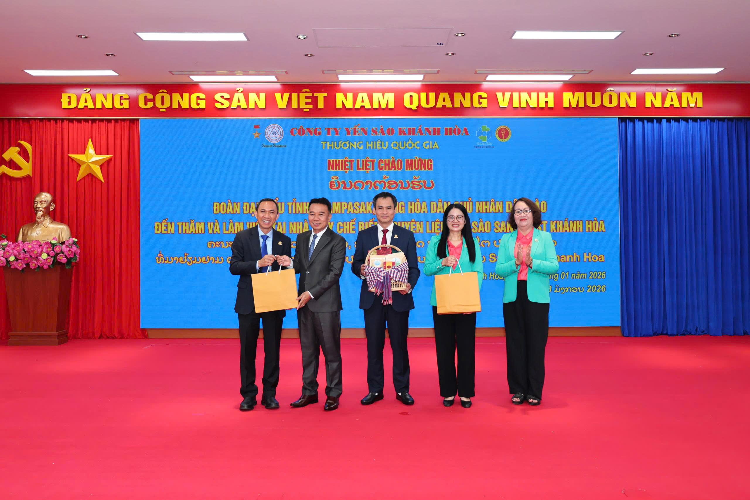 Sáng 28/1, Công ty yến sào Khánh Hòa đã đón tiếp Đoàn đại biểu cấp cao tỉnh Champasak (CHDCND Lào) đến tham quan và làm việc tại Nhà máy Chế biến Nguyên liệu Yến sào Sanvinest Khánh Hòa.