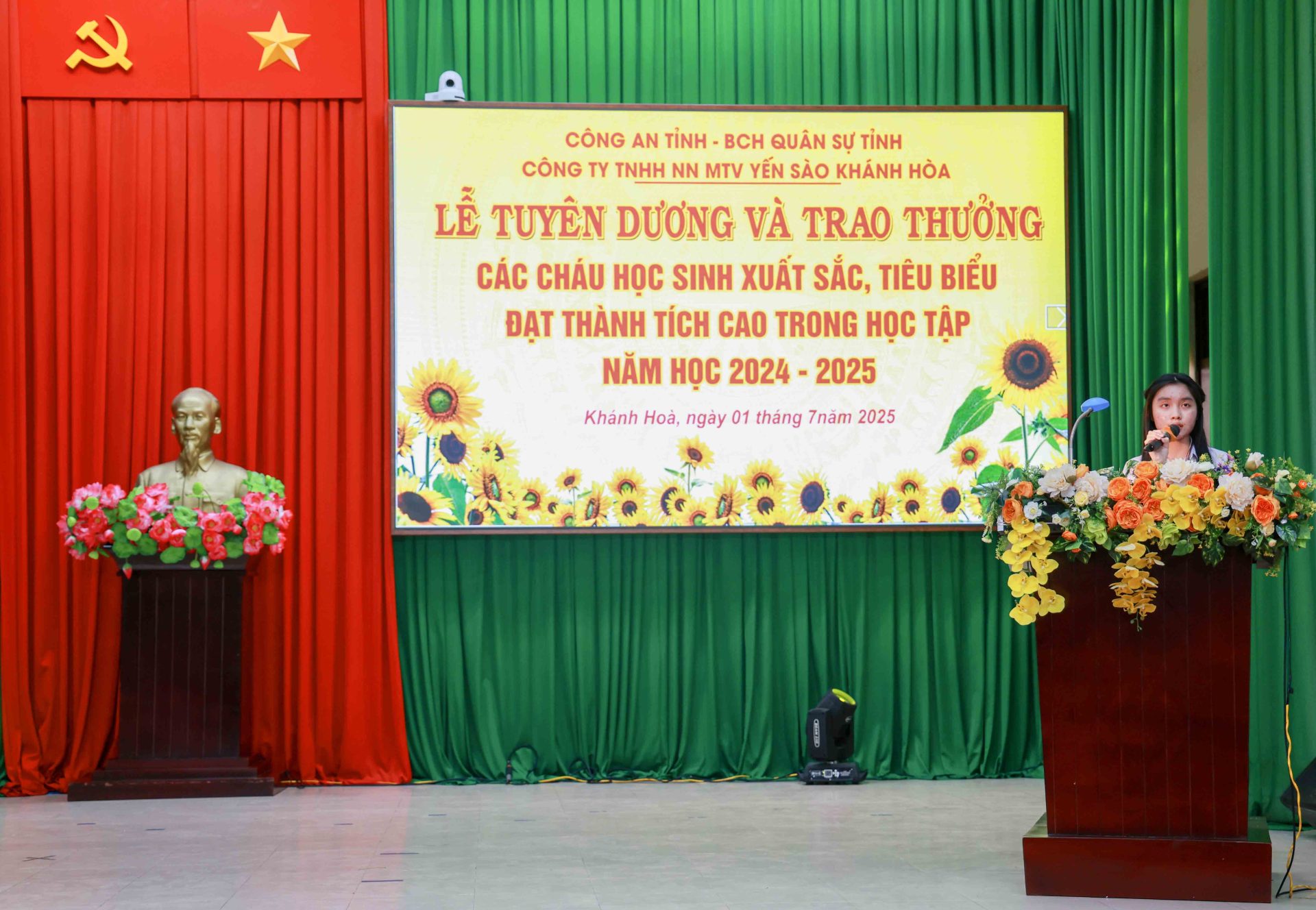 Tại buổi lễ, 22 học sinh là con cán bộ, công nhân viên Công ty Yến sào Khánh Hòa được tuyên dương, khen thưởng vì có thành tích học tập xuất sắc và rèn luyện tốt. Đây là hoạt động ý nghĩa nhằm động viên, khích lệ thế hệ trẻ tiếp tục nỗ lực học tập và lan tỏa truyền thống hiếu học trong mỗi gia đình CBCNV.