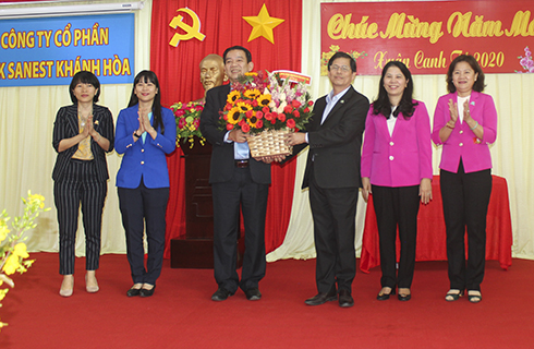 Ông Nguyễn Tấn Tuân (thứ 3 từ phải sang) tặng hoa chúc mừng năm mới lãnh đạo Công ty Yến sào Khánh Hòa.