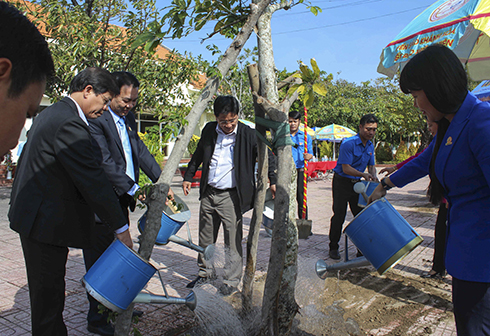 Lãnh đạo tỉnh trồng cây trong khuôn viên Công ty Cổ phần Nước giải khát Sanest Khánh Hòa.
