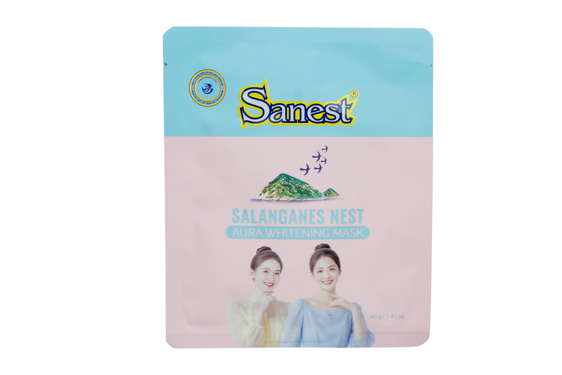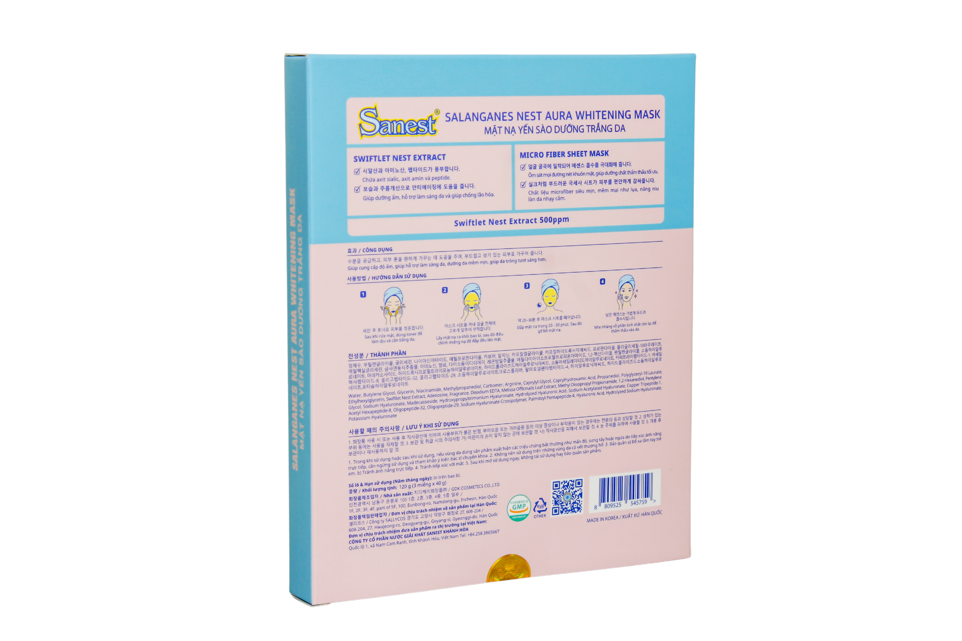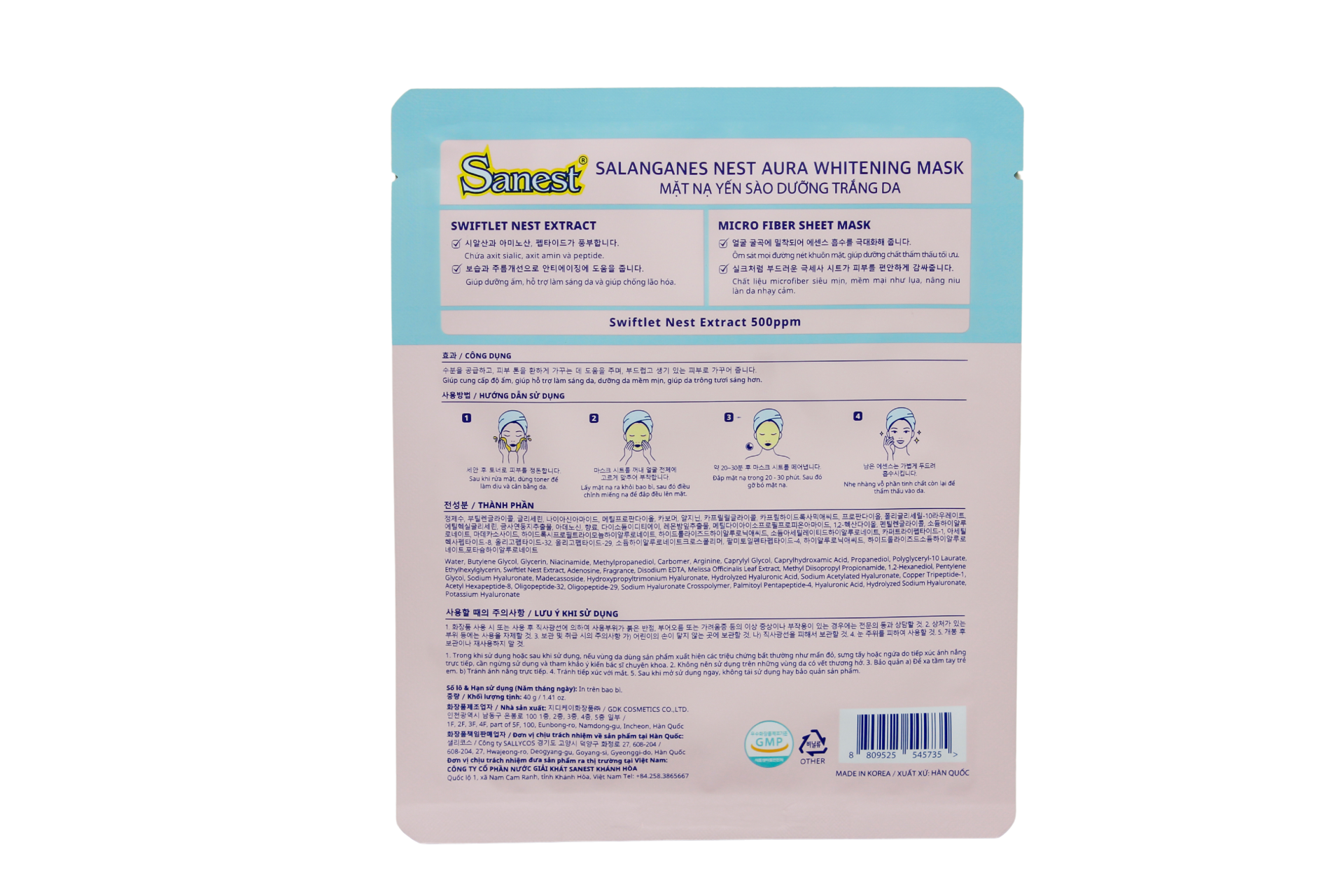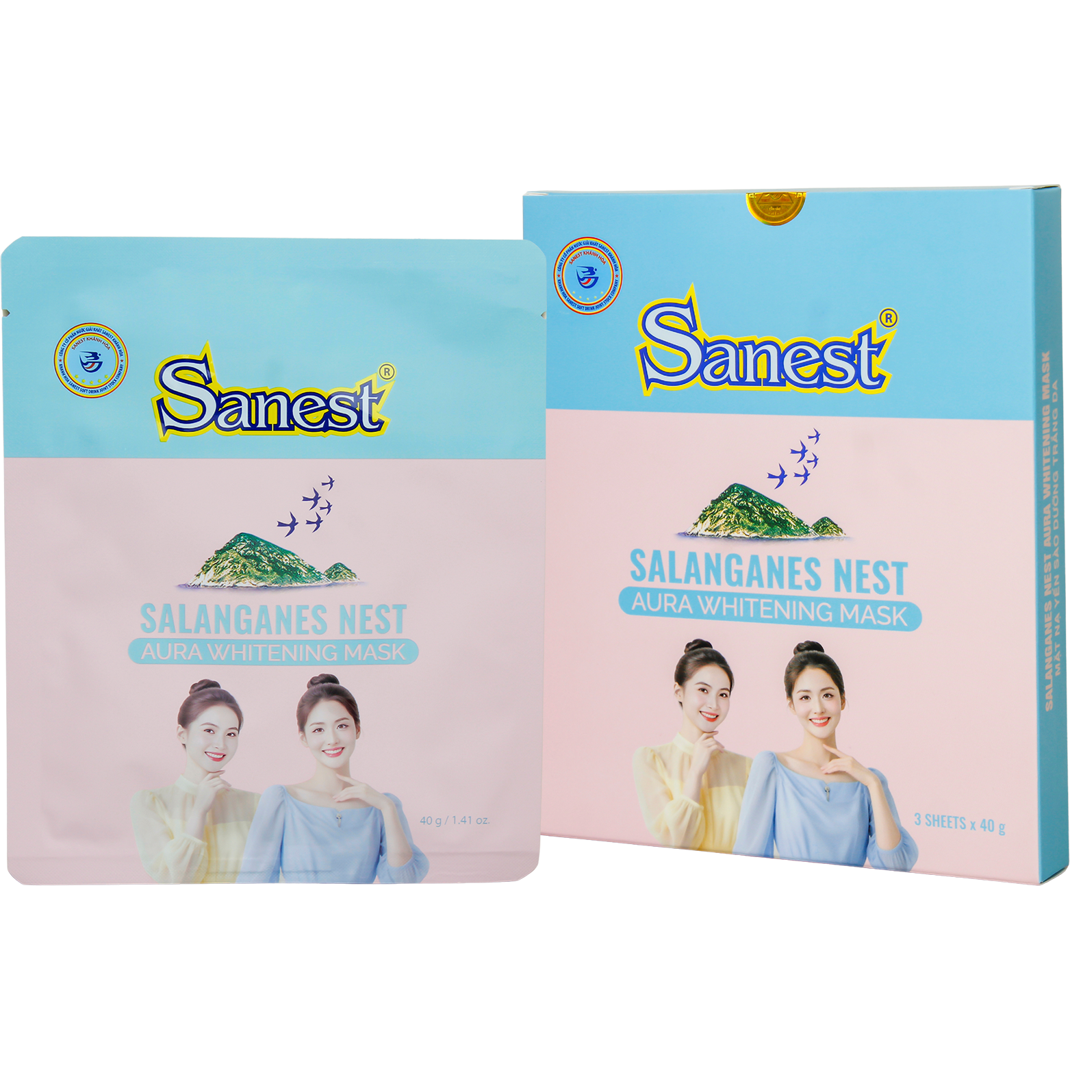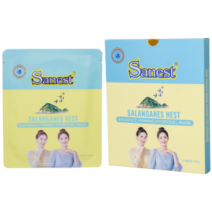Mặt nạ Yến sào dưỡng trắng da với hàm lượng chiết xuất yến sào 500 ppm, kết hợp với phức hợp 5 loại peptide, các loại dẫn xuất của axit hyaluronic cùng với Niacinamide (vitamin B3) và chiết xuất rau má.
