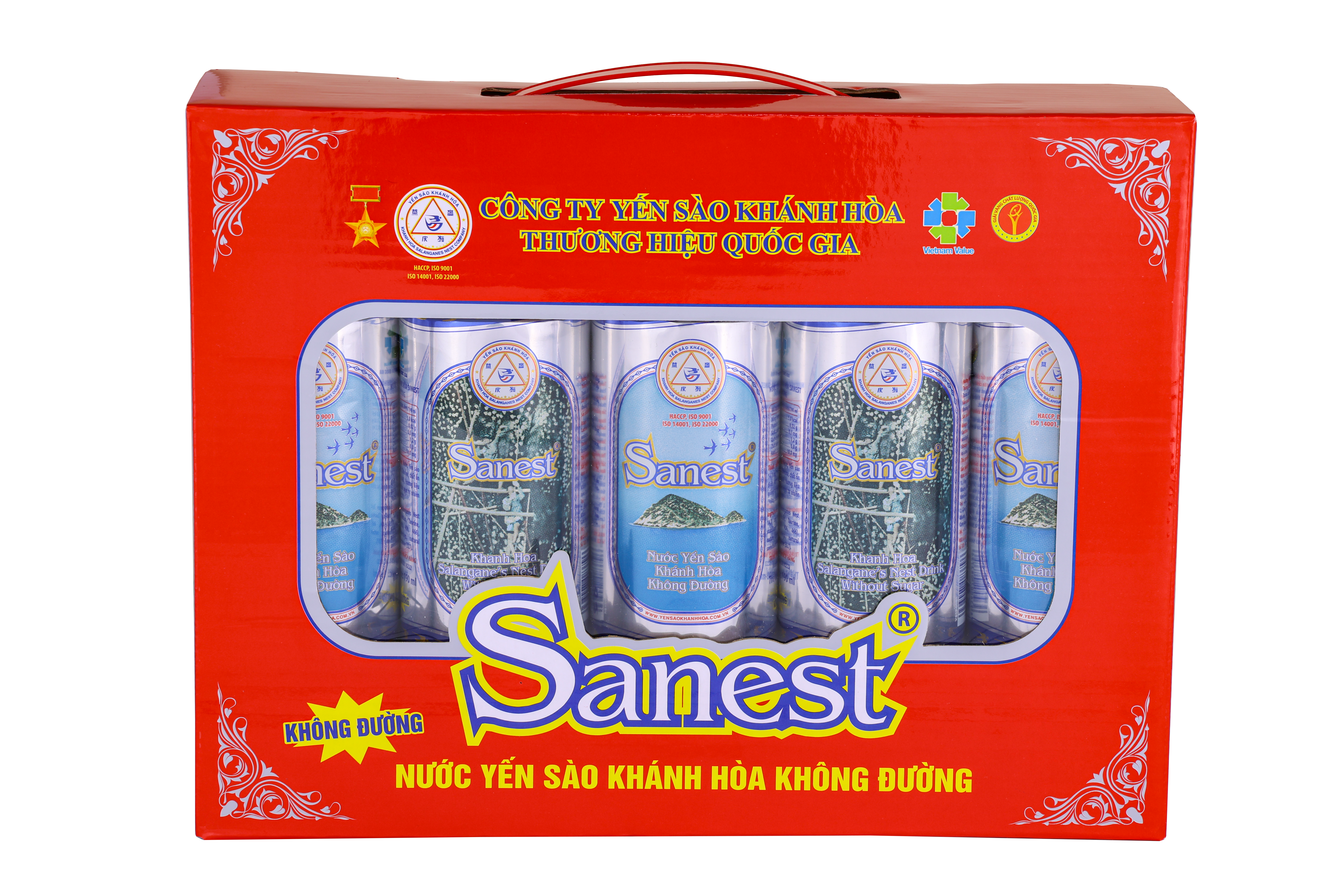 *    Nước Yến sào Khánh Hòa Sanest không đường hộp 5 lon 190 ml QT: 1,17 kg; D x R x C = 26,8 x 5,6 x 20 (cm).