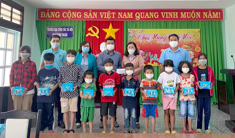 Đại diện Công ty trao tặng quà hỗ trợ cho trẻ em mồ côi, cơ nhỡ tại Trung tâm Công tác xã hội tỉnh Ninh Thuận