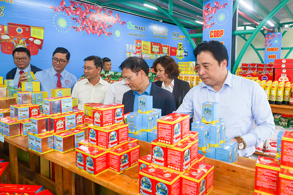 Các đồng chí lãnh đạo tham quan Gian hàng không lợi nhuận tại Nhà máy Chế biến Đặc sản Yến sào