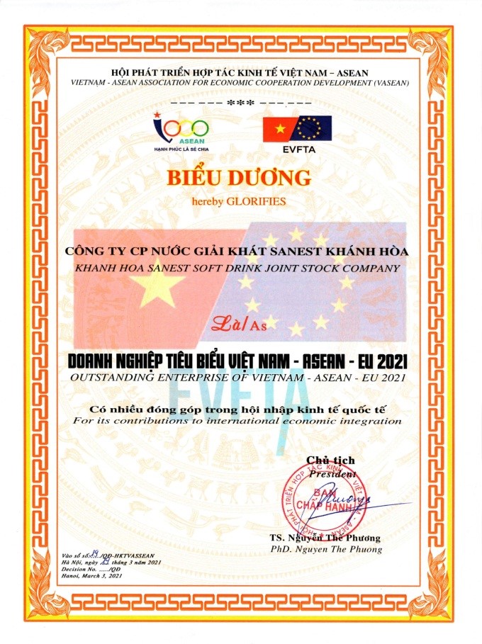 Được biểu dương Doanh nghiệp tiêu biểu Việt Nam – ASEAN – EU là niềm vinh dự và động lực mạnh mẽ cho Sanest Khánh Hòa vững tin phát triển bền vững, trở thành thương hiệu uy tín, tiêu biểu, nổi tiếng tại thị trường trong nước và từng bước nâng cao vị thế trên thị trường quốc tế.