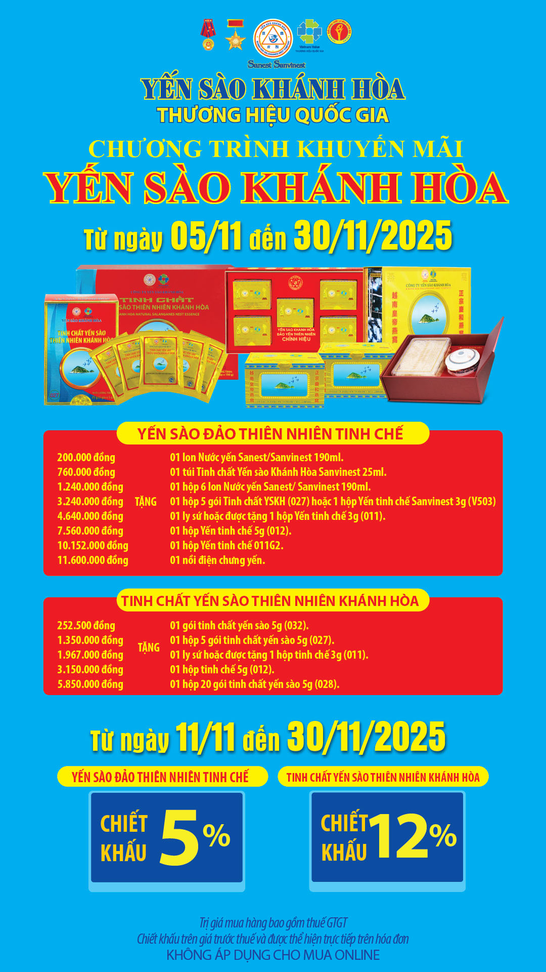 Chương trình khuyến mãi Tinh chất Yến sào Khánh Hòa Sanvinest áp dụng tại hệ thống Cửa hàng GTSP trực thuộc Công ty từ ngày 01/10/2025 đến hết ngày 31/12/2025 12/11/2025 KHUYẾN MÃI