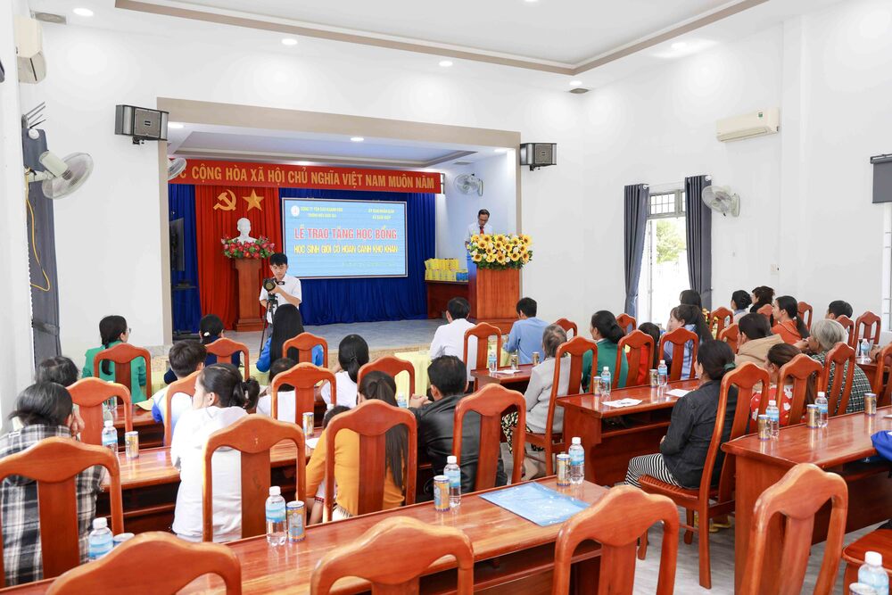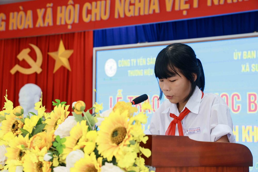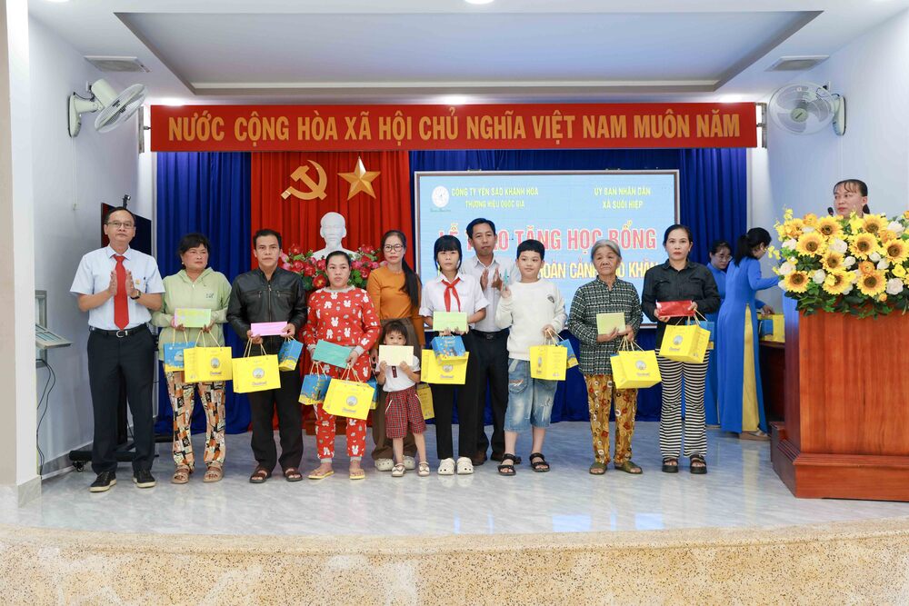 Tại đây, đại diện lãnh đạo Công ty đã ân cần thăm hỏi và trao tặng 20 suất học bổng cho các em học sinh nghèo hiếu học. Mỗi suất học bổng bao gồm hai triệu đồng tiền mặt và phần quà thiết thực (gồm sản phẩm Công ty và vở học). Số tiền trên được trích từ nguồn kinh phí dành cho hoạt động an sinh xã hội của Yến sào Khánh Hòa.